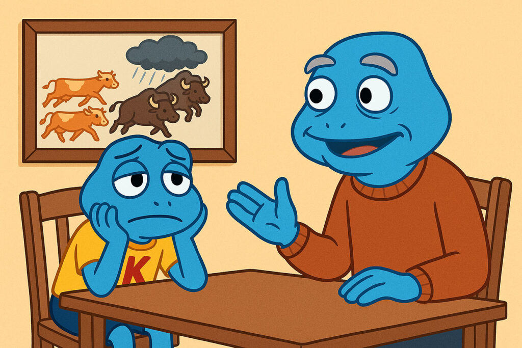 – To teraz zadaj sobie proste pytanie. Czy jesteś bardziej jak krowa czy bardziej jak bawół Będziesz oddalać od siebie moment, w którym mama pozna prawdę czy raczej wbiegniesz w burzę i szybko przyznasz się sam do tego, co zrobiłeś?